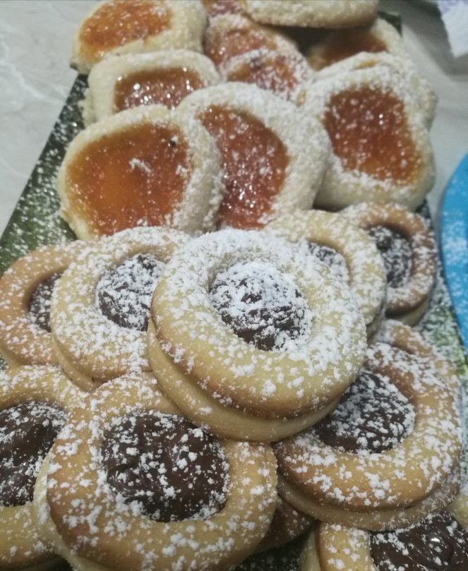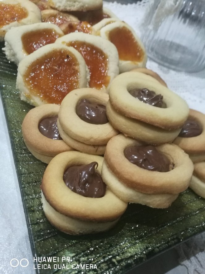 Con l’impasto della frolla che ho fatto x i cestini ripieni ho anche fatto i biscotti occhi di bue. Steso la sfoglia e fatto due dischetti. Uno l’ho svuotato dentro. Poi ho cotto e appena sfornati ho messo un cucchiaio di nutella. Per quelli alla marmellata , gli ovis mollis invece ho fatto una pallina, ho fatto un buco al centro e messo un cucchiaino di marmellata. Cotto in forno a 180° x 7/8 minuti.