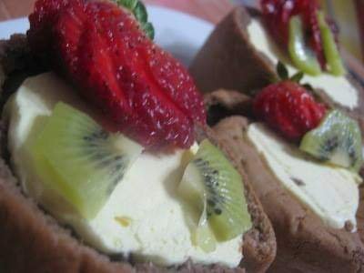 Allora…devo trovare la ricetta che al momento non trovo….ahimè . Ma appena possibile la posto subito. Intanto la foto la posto eccome perché questo dolce è buonissimo e non molto difficile da fare per chi è esperta di pan di Spagna. In breve è un rotolo di pan di Spagna al cioccolato farcito con panna e crema al mascarpone e colla di pesce (ecco perché non ricordo le dosi ) e decorato con fragole e frutta fresca . L’ho fatto anni fa…e la foto mi è passata tra le mani ieri ricordando quel sapore buono e delicato. Una torta ….a rolle’.