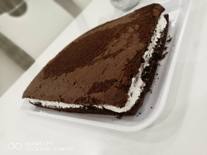 Pan di Spagna al cioccolato e farcia panna,latte condensato, miele e colla di pesce.